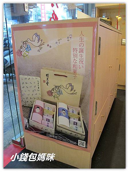 店門口有展示彌月禮盒的包裝和一些可以單賣的和菓子