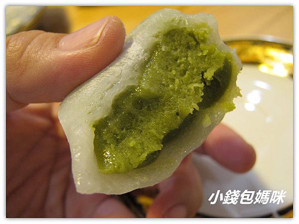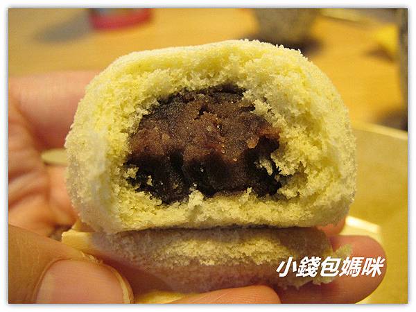 看看這皮薄餡多,入口有抹茶香,跟上面的紅豆餡料比起來,比較不甜