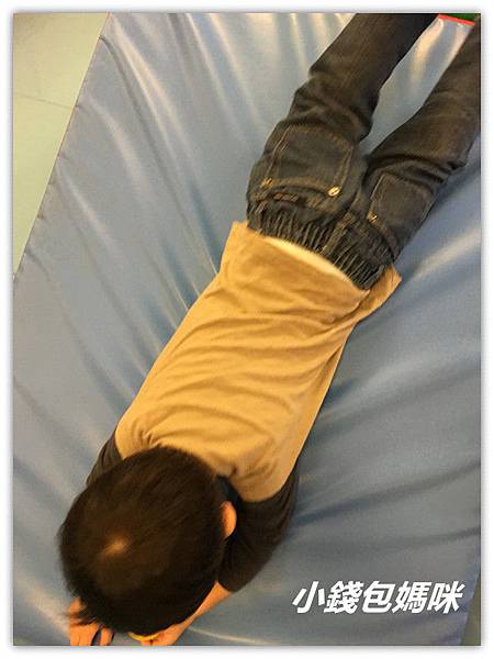 另一個是後來加的,身體趴在滾筒上,大人幫他滾向另一邊,小朋友雙手會往前撲