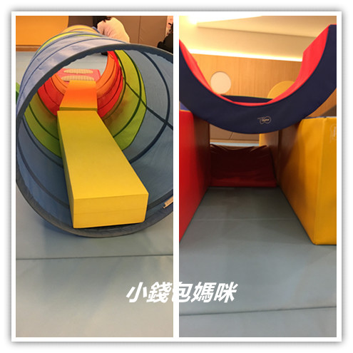 老師左右都用了爬行的教具,一個是老師疊的山洞,另一個是毛毛蟲的洞