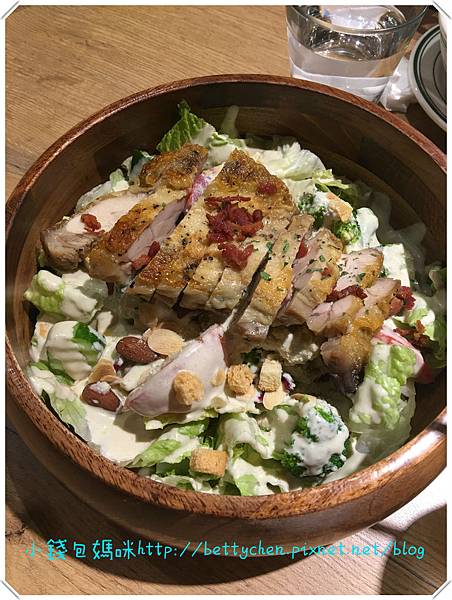 這雞腿肉真的很嫩喔~~生菜裡有些養生的核果類,和凱撒醬搭起來很清爽