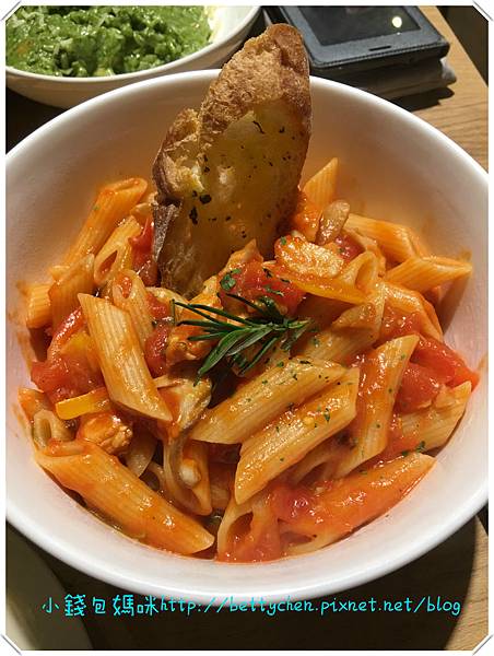 均勻沾附的茄汁的斜管麵,很有嚼勁,好吃也很有飽足感